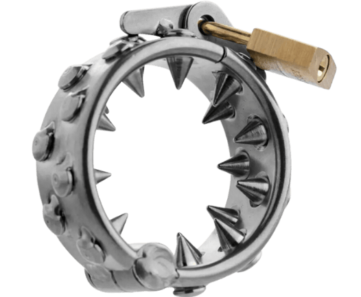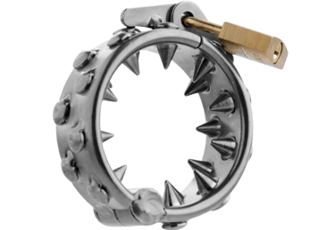 Introducing the spiked locking ring, the ultimate CBT device designed to elevate your experience of pleasure and pain. Crafted from durable stainless steel, this ring securely locks around the scrotum, penis, or both, featuring 18 quarter-inch spikes that tease and torment tender flesh. Whether you're a sadist reveling in control or a masochist seeking exquisite pain, this device promises a unique experience. The weight of the heavy material enhances its effectiveness as a ball stretcher, pulling down on sensitive areas to create sensations that you won’t forget. Perfect for those who want to explore boundaries, this dastardly tool keeps your most sensitive parts under lock and key and places you in a thrilling predicament. Embrace your darkest desires with the spiked locking ring, where pleasure meets exquisite torment. Be sure to also purchase an app controlled key lock box and we can really make this fun!!