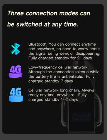 The device offers three versatile connection modes to suit your needs, easily switchable at any time: - **Bluetooth**: Connect anytime, anywhere, without worrying about weak signals or disconnections. Enjoy a remarkable standby time of 21 days on a full charge. - **Low-frequency cellular network**: While the connection may take longer to establish, it boasts an impressive battery life of 7 days on a full charge. - **4G cellular network**: Always ready for use, this mode provides 1-2 days of standby time on a full charge. With the integrated SIM card slot, true remote control capability is at your fingertips, allowing control without a direct connection to the Qiui app, offering you unparalleled freedom and flexibility. Please note that a subscription is required for this feature.